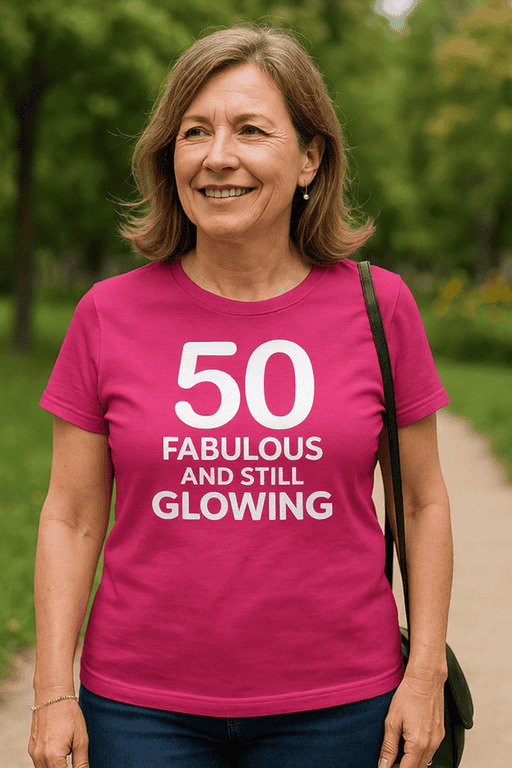 Big 5-0? Make it a moment. This magenta T-shirt with bright white text is the ultimate confidence booster—walk in, sparkle, and let the compliments do the talking. 😉