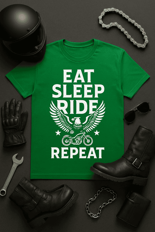 Rev up your wardrobe with our ‘Eat Sleep Ride Repeat’ tee – made for those who live life on two wheels.