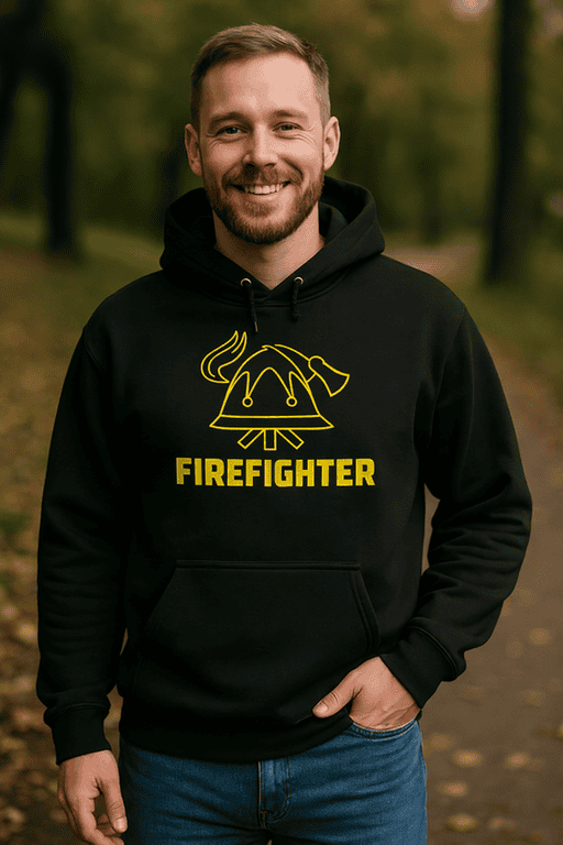 This black hoodie brings big station energy with a striking helmet icon, flame, and axe—made for everyday heroes (and the people who love them). Wear it to drills, cookouts, meetups, or that legendary late-night snack run—because pride looks good in any setting. 😄