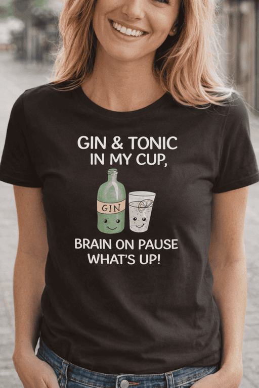 When the gin shows up, your overthinking checks out. This black short-sleeve women’s T-shirt features a cute, cheeky gin bottle and a G&T with a lemon slice (both with faces) plus a slogan that says exactly what you’re feeling—no explanation needed.