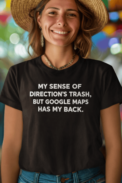 If your sense of direction is basically a suggestion, this shirt says it for you: MY SENSE OF DIRECTION’S TRASH, BUT GOOGLE MAPS HAS MY BACK. Perfect for the friend who can’t find the exit in a parking lot—but somehow always finds the nearest coffee. ☕📍