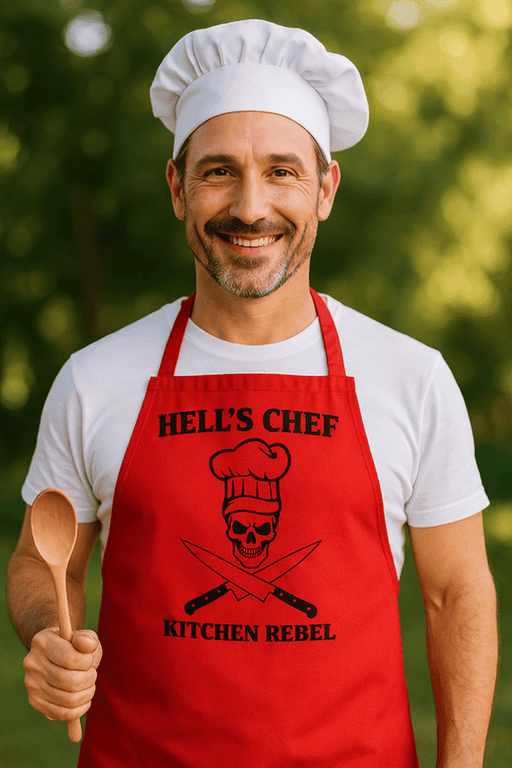💀🔥 Turn up the heat and the attitude. This bold red apron with a skull chef and crossed knives is made for grill masters and kitchen rebels with a sharp sense of humor. 🔪😈