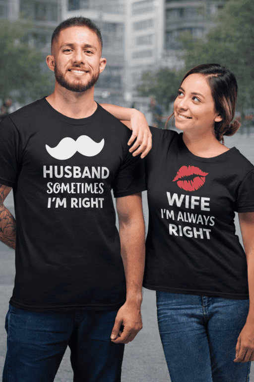 This matching set says it all—his tee admits he’s right… sometimes, and hers politely (but confidently) reminds everyone she’s always right. Finished with a bold mustache icon and a kissy lips illustration, it’s the perfect mix of cute and hilarious for date nights, photos, and everyday laughs.