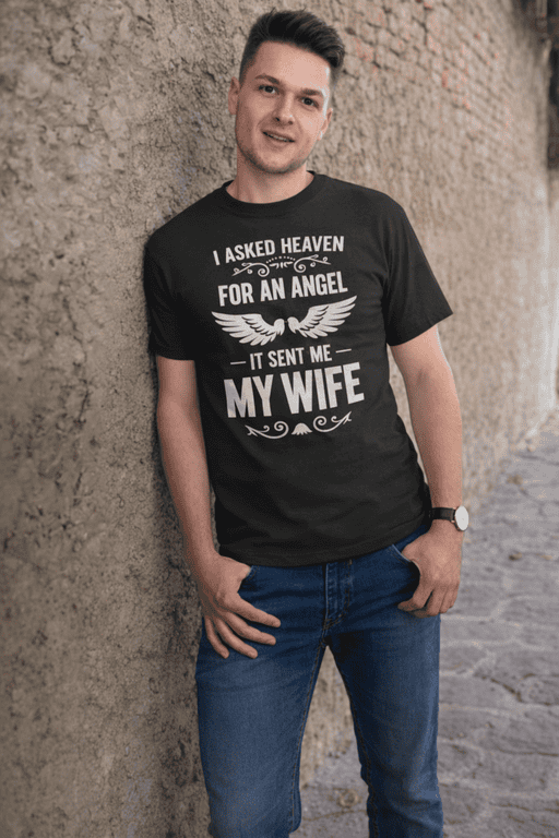 This men’s tee with decorative swirls and wings brings the sweet-and-funny energy in one bold line: “I ASKED GOD FOR AN ANGEL HE SENT ME MY WIFE”. Wear it and let everyone know you found your angel—and you’re not shy about it.
