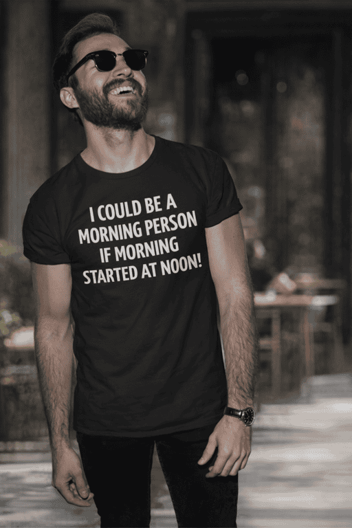😴 Not a morning guy? Same. This tee says it for you: “I could be a morning person if morning started at noon!” Perfect for night owls, students, and anyone who doesn’t fully boot up before 12.