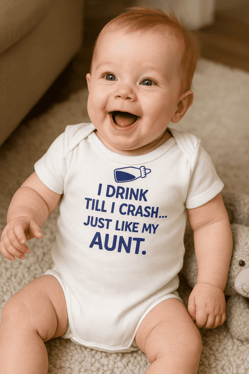 🍼😂 Tiny sips, big attitude! This baby bodysuit says “I DRINK TILL I CRASH… JUST LIKE MY AUNT.” Perfect for newborn laughs, funny baby photos, and proud aunts everywhere.