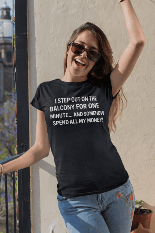 You step out “just for a minute”… and somehow you’re placing an order. This black women’s short-sleeve T-shirt with a crisp white print delivers the ultimate shopping confession: “I STEP OUT ON THE BALCONY FOR ONE MINUTE… AND SOMEHOW SPEND ALL MY MONEY!”