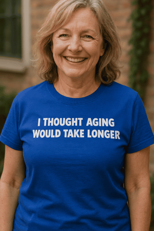 This text-only tee delivers the realest reality check: I THOUGHT AGING WOULD TAKE LONGER. Wear it when the calendar is moving faster than you are—while you keep the jokes coming. 😅