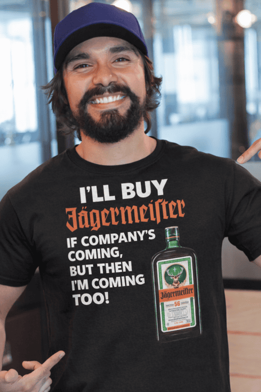 This black unisex T-shirt says it loud with a bold slogan and a Jägermeister bottle illustration. Perfect for the friend who always “just needs one minute” but somehow shows up with the party energy (and the bottle) every time. 😄