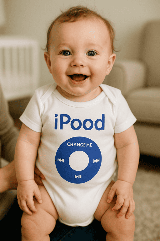 🎶 When the track ends, the screen reads: iPood CHANGE ME! Diaper me, please! 😄 This white baby bodysuit with blue print mimics an MP3 player and features the most honest playlist: from the “silent alarm” to the chart-topping hit that screams for a fresh diaper. iPood CHANGE ME says it all before the drama starts—parents, ready for action? 🎁