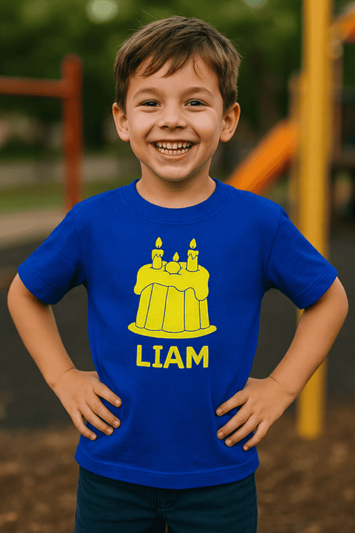 This fun kids short-sleeve tee features a bright yellow cake with three candles and a bold name underneath, so nobody has to guess who’s celebrating. One look and you’ll hear “Happy Birthday!” all day long. 😄