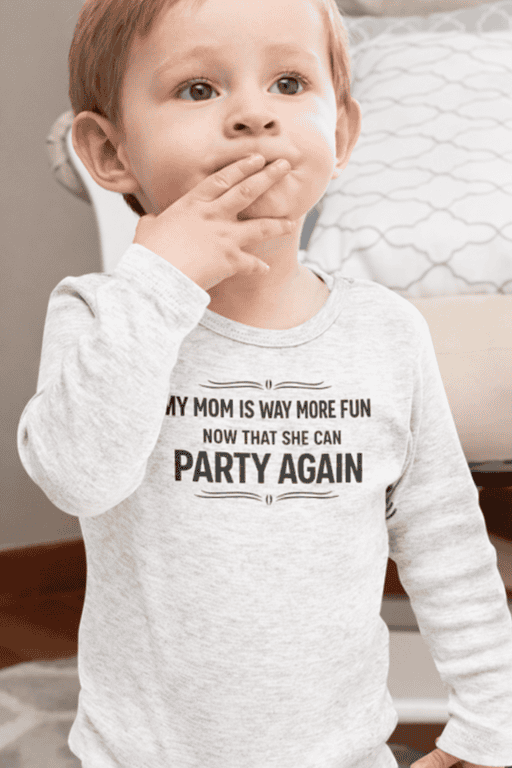 When Mom’s back to being able to toast again, baby’s here to announce it—front and center. This bodysuit with “MY MOM IS WAY MORE FUN NOW THAT SHE CAN DRINK AGAIN” brings instant laughs at family visits, friend meetups, and every photo op.