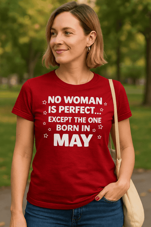 This fun, starry women’s tee says it loud and proud: “NO WOMAN IS PERFECT… EXCEPT THE ONE BORN IN MAY.” Cute, confident, and guaranteed to get laughs (and a few “that’s so true!” comments) wherever you go. ✨
