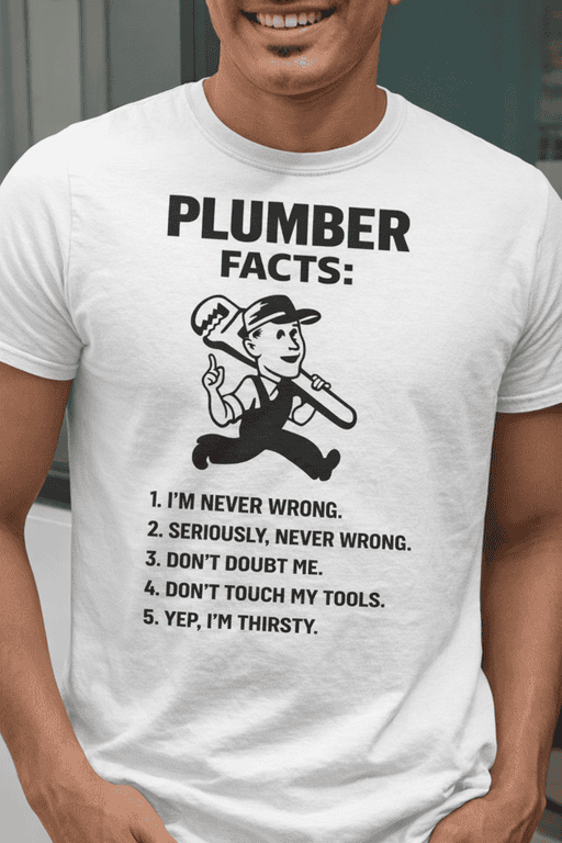 This white tee features a cartoon plumber holding a wrench and a list of “facts” every job site legend lives by. Wear it to the shop, the bar, or the couch—just remember rule #4: hands off the tools.