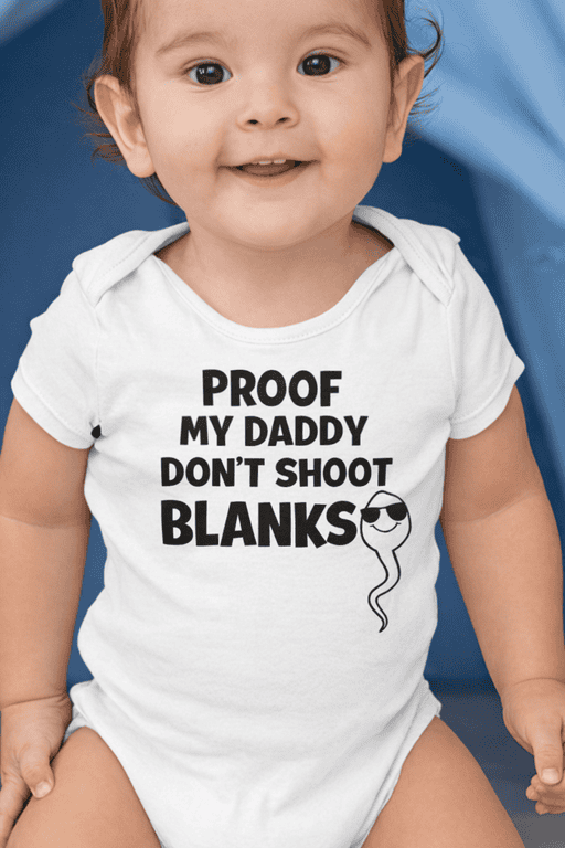 Let baby deliver the punchline with “PROOF MY DADDY DON’T SHOOT BLANKS” alongside a sunglasses-wearing swimmer graphic. It’s cheeky, silly, and basically guaranteed to get giggles (and a few shocked laughs) at the first family visit.