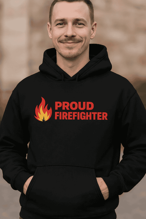 This black hoodie brings the message with a bold flame icon and “PROUD FIREFIGHTER” front and center. Whether you’re heading to the station, grabbing coffee after a long shift, or just repping the brotherhood on the weekend, it’s the kind of clean, confident look that speaks for itself. 😉