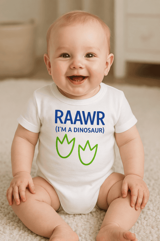 🦖 Big roar, tiny dino! This white short-sleeve bodysuit with green dinosaur footprints says it all: “RAAWR / I’M A DINOSAUR.” Perfect for newborns, baby showers, and parents who love a little prehistoric humor.