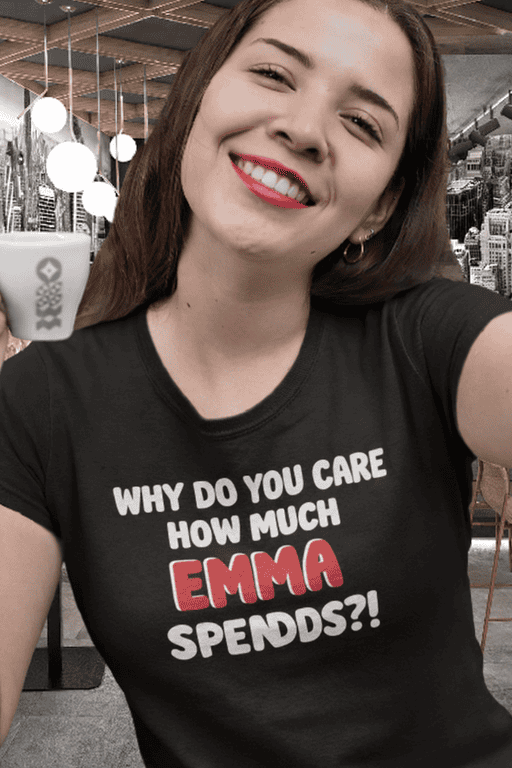 When someone’s busy counting your purchases, this shirt does the talking: “WHY DO YOU CARE HOW MUCH EMMA SPENDS?!” No explanations, no receipts, no guilt—just bold attitude in clean, punchy text.